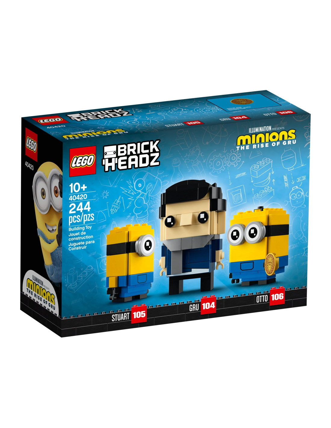 Součástí sady Gru, Stuart a Otto (40420) od LEGO® BrickHeadz™ jsou 3 postavy z filmu Mimoni: Gru, mimoň Stuart a mimoň Otto s kamenem zvěrokruhu. Všechny tyto figurky jsou součástí sbírky LEGO BrickHeadz, mají vlastní identifikační číslo a robustní podstavec pro snadné vystavení – ať už samostatně, nebo po boku ostatních modelů z řady BrickHeadz. Tato sběratelská stavebnice dětem umožní postavit si zábavné LEGO® BrickHeadz™ modely tří slavných postaviček z filmu Mimoni 2: Padouch přichází. Sada zaručí parádní stavitelský zážitek dětem starším 10 let a představuje skvělý dárek pro všechny fanoušky LEGO® stavebnic a mimoňů. Pro ještě zlomyslnější zábavu ji zkombinujte se sadou 40421 Belle Bottom, Kevin a Bob od LEGO® BrickHeadz™. Gru měří přes 8 cm na výšku a ostatní mimoni přes 6 cm na výšku, takže poskytnou spoustu prostoru pro kreativní hraní. Stavebnice obsahuje 244 dílků. BrickHeadz 2016 - 2026 191